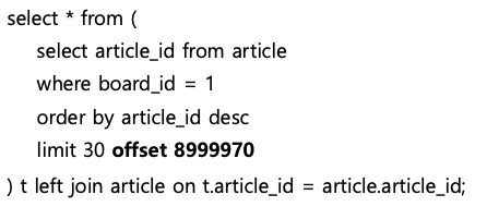 mysql> select * from (select board_id, article_id from article where board_id = 1 order by article_id desc limit 30 offset 1499970) t left join article on t.article_id = article.article_id;