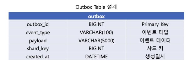 트랜잭션에서 비즈니스 로직이 잘 수행되면 이벤트 데이터를 Outbox 테이블에 저장하고, 다른 시스템에서 Outbox 테이블에서 미전송 이벤트를 조회해서 카프카에게 전송한다. 전송이 완료되었다면 완료 처리로 상태를 변경한다.