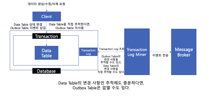 Transaction Log Tailing을 활용하면 Data Table의 변경 사항을 직접 추적할 수 있다. Outbox Table이 필요하지 않을 수 있다. 하지만, Data Table은 메시지 정보가 데이터베이스 변경 사항에 종속된 구조로 한정 되버리고 만다. 하지만 Outbox Table을 활용하면, 부가적인 테이블로 인한 복잡도 및 관리 비용은 늘어나지만, 이벤트 정보를 더욱 구체적이고 명확하게 정의할 수 있다. 따라서 Outbox Table을 활용한다.