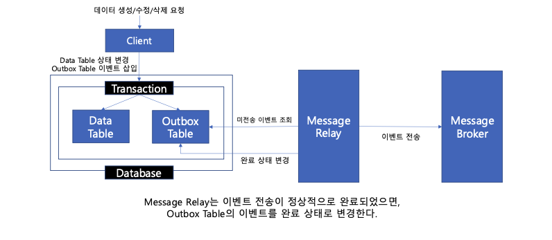 데이터베이스 트랜잭션 커밋이 완료되었다면, Outbox 테이블에 이벤트 정보가 함께 기록되었기 때문에, 이벤트가 유실되지 않는다. 하지만 추가적인 Outbox 테이블 생성 및 관리가 필요하고, Outbox 테이블의 미전송 이벤트를 Message Broker로 전송하는 작업이 필요하다.