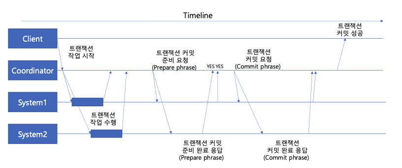 분산 시스템에서 모든 시스템이 하나의 트랜잭션을 수행할 때, 모든 시스템이 성공적으로 작업을 완료하면, 트랜잭션 commit, 하나라도 실패하면 트랜잭션 rollback한다. 이름에서 알 수 있듯이, 두 단계로 나뉘어 수행된다.