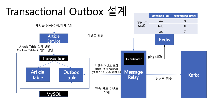이벤트 전송이 필요한 Article, Comment, Like, View 서비스는 트랜잭션을 지 원하는 MySQL을 사용하고 있기 때문에, Outbox 테이블과 트랜잭션을 통합하여 구현할 수 있다. Message Broker로의 전송은 스프링부트에서 직접 개발하고 처리한다.